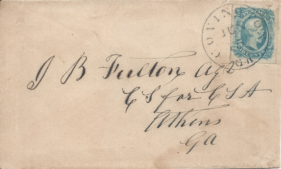| GA1032 | CSA #12a (AD) (4-Margin Milky Blue) tied by the BLUE Covington, Ga CDS 15 JUN. Addressed to J. B. Fulton Agt, CS (Commisary of Subsistence) for CSA, Athens, Ga. Minor reduction at the right, otherwise Very Fine. | $150.00 |