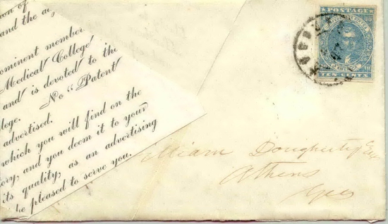 | GA1034 | CSA #2 Paterson (4-Margin) tied by the small double circle Augusta, Ga CDS (date not fully apparent). Addressed to William Dougherty Esqr, Athens, Geo. Adversity Cover made from a printed circular apparently soliciting advertising in a medical journal displayed flapped over from the left. Central diagonal file fold. The cover has been expertly restored along the folds and the edges to a Very Fine appearance with a very nice stamp. | $500.00 |
