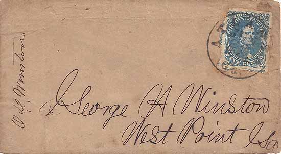| GA1036 | CSA #4 Stone 2 (not plated) (4-Margin with parts of adjoining stamps at the bottom) tied by the Atlanta, Ga CDS 26 JUN 1862. Coarse brown paper cover addressed to George A. Winston, West Point, Ga. Clean cover with a minor backflap opening tear. | $200.00 |