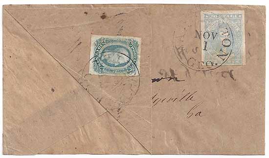| GA1042 | Turned Cover -- 1st Use: CSA #2 Paterson Stone Y (4-Margin) tied by the Covington, Geo CDS 1 NOV to Mrs. Mary Brown Care of S. B. Brown, Milledgeville, Ga. 2nd Use: CSA #12 (AD) (4-Margin) tied by the Milledgeville, Ga CDS (date not fully apparent) to S. A. Jewell, Mayfield, Warren Co., Georgia. Cover flapped up from the lower left to display both stamps. Very Fine Turned Cover with a Stone Y stamp. | $650.00 |