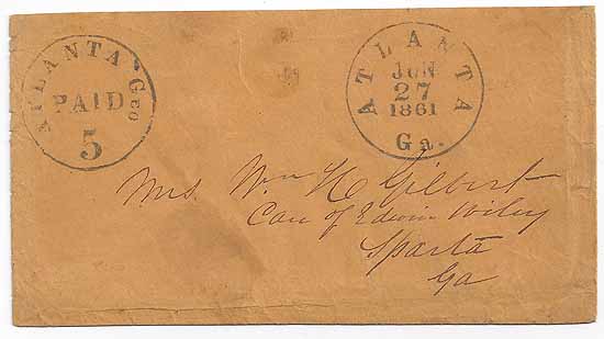 GA1048 | CSA #6ux2 Atlanta, Geo Handstamp PAID 5 Provisional 27 JUN 1861. Orange paper cover addressed to Mrs. Wm. H. Gilbert Care of Edwin Wiley, Sparta, Ga. The cover is not listed in the Crown census. A little minor staining and minor edge wear and a missing backflap. Very nice strikes of the postal markings and an overall very clean cover. | $700.00 |