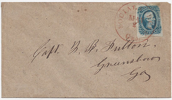 | GA1097 | CSA #12 (AD) (4-Margin) tied by a very nice strike of the RED Social Circle, Geo CDS 2 MAY. Coarse brown paper cover with Military Address to Capt J. B. Fulton, Greensboro, Ga. Captain Joseph B. Fulton was a staff officer and the "CSA Agent" (most likely a quartermaster) in Greensboro, Ga. Very Fine Cover. | $250.00 |