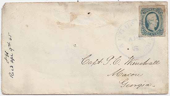 CSA #12 (AD) (4-Margin) tied by a full strike of the VIOLET Augusta, Ga CDS 5 APR (1865). Receiving docketing at left "Rc'd April 9th 65." The cover was received the day General Lee surrendered at Appomattox Court House, Va. Military Address to Capt J. C. Wrenshall, Macon, Georgia.