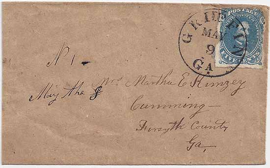GA1194 | CSA #4 Stone 2 Position 23 (margins a little irregular at the top and upper right) tied by a full struike of the Griffin, Ga CDS 9 MAY (1862). Light coarse paper cover addressed to Mrs. Martha E. Kimsey, Forsyth County, Ga. Very clean cover reduced a little at the left not affecting anything. | $250.00 |