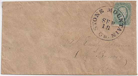 | GA1196 | CSA #11d Green (4-Margin) tied by a full strike of the Stone Mountain, Ga CDS 18 SEP. Addressed to Miss S. Emily Forman, Oak Bowery, Ala. Notation on the reverse signed by Brian Green affirming the green color of the stamp. Very Fine. | $275.00 |