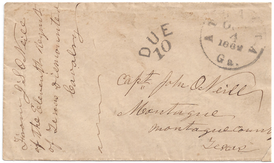 Stampless Soldier's Due cover with the Atlanta, Ga CDS and handstamp arc DUE 10 Type C 4 OCT 1862. Addressed to Capt John O'Neill, Montague, Montgague County, Texas. Endorsed at left "From J. S. O'Neill of the Eleventh Regiment of Texas Dismounted Cavalry (11th Tex Cav)."