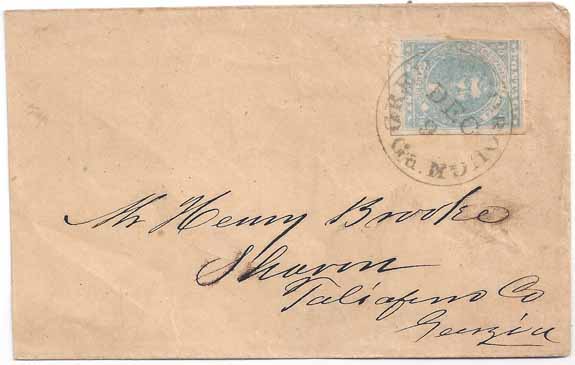 | GA1219 | CSA #2 Paterson affixed sideways (margin a little close at the top left) tied by the Greensborough NC CDS 9 DEC. Addressed to Mr. Henry Brooke, Sharon, Taliaferro County., Georgia. Reduced at left where opened affecting nothing. Very clean cover. | $200.00 |