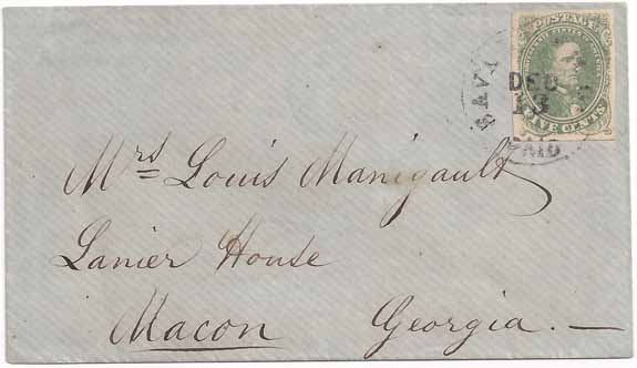 | GA1220 | CSA #1 Stone 1 Position 16 (4-Margin) tied by the Savannah, Ga PAID CDS 13 DEC (1861). Cover from the well-known Manigault Correspondence addressed to Mrs. Louis Manigault, Lanier House, Macon, Georgia. Very Fine. | $250.00 |