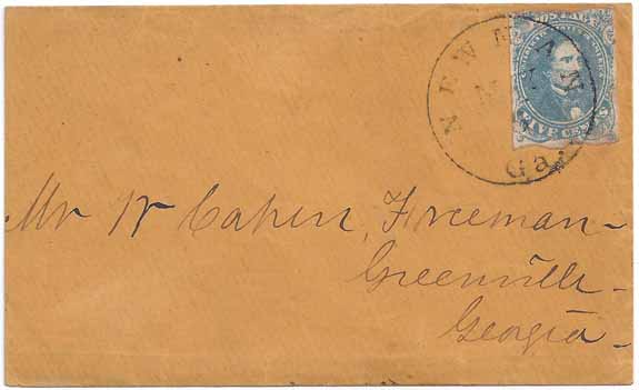 GA1223 | CSA #4 Stone 2 Position 29 (margin in at the top center) tied by the Newnan, Ga Balloon CDS 5 MAY (1862). Orange paper cover addressed to Mr. W. C--. Freeman, Greenville, Georgia. Small reduction at the left where opened. Clean cover. | $150.00 |