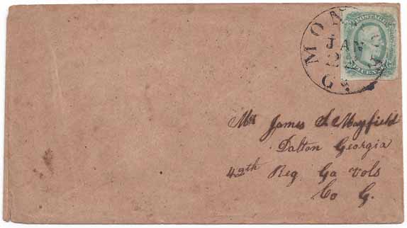 GA1227 | CSA #12c (AD) Bluish-Green (4-Margin) tied by the Monroe, Ga CDS 22 JAN (1864). Coarse brown paper cover which appears to be homemade with a Military Address to Mr. James S. Mayfield, Dalton, Georgia, 42nd Reg Ga Vol Co G. Very Fine. James S. Mayfield enlisted as a private in Co G 42nd Ga Inf 11/15/1862. He is listed as having Died of Disease 8/16/1864. |