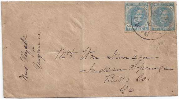 | GA1230 | CSA #7 Two Singles (4-Margin) tied together by a partial strike of the Manassas, Ga CDS 26 MAY. Coarse brown paper homemade adversity cover addressed to Mrs. William Duncan, Indian Springs, Butts Co., Ga. Very clean cover. | $100.00 |