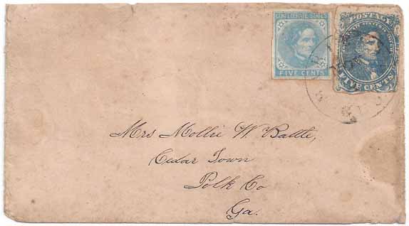 | GA1238 | CSA #4 Stone 2 (not plated) (margin in at the bottom) and CSA #6 (4-Margin) used in combination to make the 10c rate tied together and to the cover by the Marietta, Ga CDS 4 NOV (1862). Light coarse brown paper cover addressed to Mrs. Mollie W. Battle, Cedar Town, Polk Co., Ga. Top back flap missing, small sealed edge tear at top center, and a light stain at the lower right edge. Still a very decent example of a not commonly seen combination use. | $300.00 |