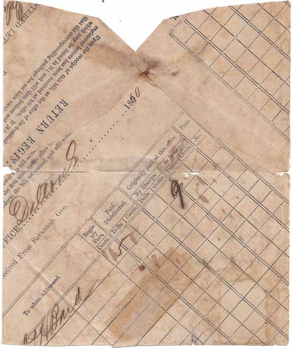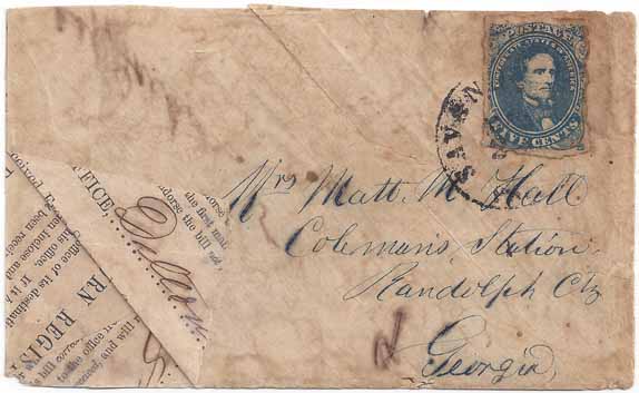 | GA1242 | CSA #4 Stone 2 Position 2 (margin in at the bottom left corner and with some edge gum toning) tied by the Savannah, Ga CDS 2 MAY (1862). Addressed to Mrs Matt M. Hall, Coleman Station, Randolph Cty, Georgia. Adversity Cover made from an 1860 used US Post Office printed Registry Ledger. Shows wear and top back flap missing. Displays well with the lower left corner flapped up. | $250.00 |