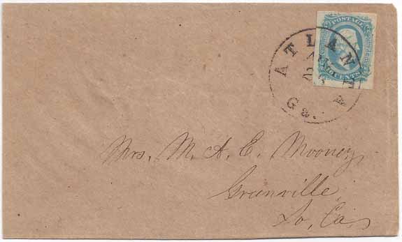| SC1249 | CSA #11a (AD) Milky Blue (4-Margin) tied by the Atlanta, Ga CDS 25 AUG. Light brown coarse paper cover addressed to Mrs. M. A. E. Mooney, Greenville, So. Ca. Minor reduction at left where opened, otherwise Very Fine. Ex-Kohn. | $125.00 |
