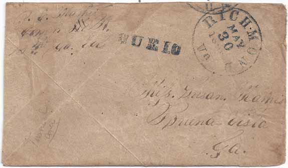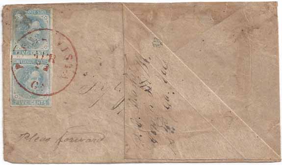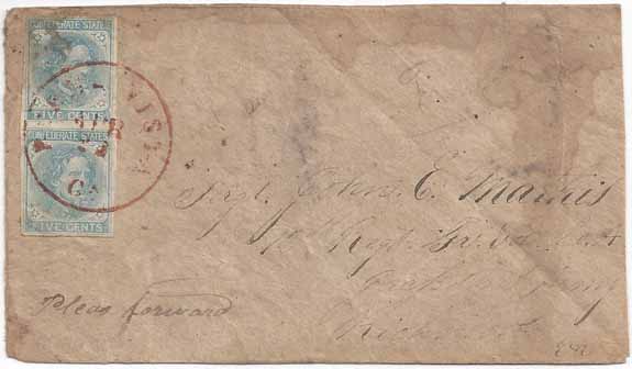 Turned Cover -- First Use (displayed) CSA #7 Vert Pair (4-Margin with light soiling at upper left) tied by the RED Buena Vista, Ga CDS 23 APR (1863). Military Address to Sergt John E. Mathis, 12th Regt Ga Vol Co A, Jackson's Army, Richmond, Va. Second Use -- Stampless Soldiers Due with the BLUE Richmond, Va CDS Richmond Powell Type 5b and handstamp DUE 10 Type Q. Addressed to Miss Susan Harris, Buena Vista, Ga. Endorsed at upper left "J. E. Mathis Comp A 12th Ga Vols." A little light minor staining. Still a very presentable turned cover use with a military address and endorsement.