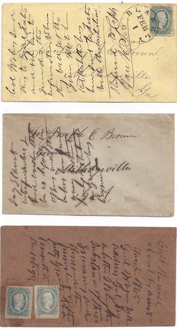 GA1253 | Three Covers (no contents) from the Georgia Governor Joseph E. Brown Correspondence -- First Cover - CSA #11 (AD) (margin touches at the left) tied by the Blakely, Ga CDS 1 FEB (1864). Addressed to His Excellency J. E. Brown, Milledgeville, Ga. Extensive receiving docketing on the face of the cover concerning the original contents written by Governor Brown himself in his distinctive handwriting. Second Cover - CSA #11c (AD) Greenish-Blue (margin touches at the right) on the reverse used to seal the back flap and tied by the Bainbridge, Ga CDS 10 MAY (most likely 1864). Stamp not damaged in opening. Addressed to Joseph E. Brown Governor, Milledgeville, Ga. Extensive receiving docketing on the face of the cover concerning the original contents written by Governor Brown himself in his distinctive handwriting. Third Cover - CSA #11 (AD) two singles double weight rate (one stamp 4-Margin and one stamp touches at right) tied by a very weak strike of a VIOLET CDS which is most probably Augusta, Ga. Milledgeville, Ga. Extensive receiving docketing on the face of the cover concerning the original contents written by Governor Brown himself in his distinctive handwriting. Very late use as the docketing dates the cover to MAR 1865. Sherman's Army bypassed Augusta on the March to the Sea and did not occupy Augusta. Millegeville was the Georgia State Capital during the war. All three covers are complete and clean. Governor Brown's handwriting is very difficult to read, and I cannot completely decipher the handwriting. Deciphering the full docketing on the three covers will be a challenge for anyone trying to read the handwriting but could yield interesting results. |