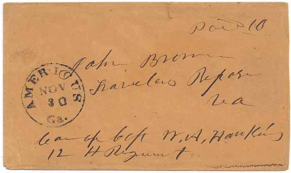 Stampless cover with the Americus, Ga CDS and manuscript "Paid 10" 30 NOV (1861). Orange paper cover with Military