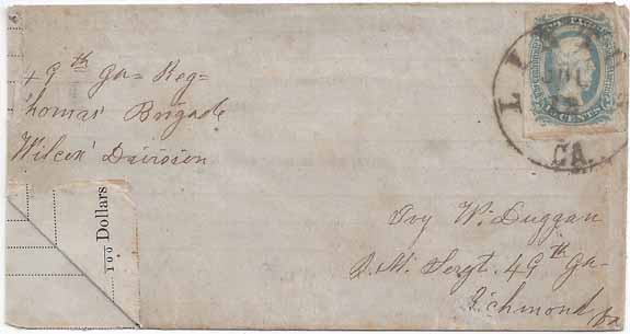CSA #11 (AD) Light Blue (4-Margin) tied by the Linton, Ga CDS 12 JUL. Adversity Cover made from a printed but unused Army form displayed with the left lower corner flapped up. Military Adress to Ivy W. Duggan, Q. M. Sergt 49th Ga, Richmond, Va. At left "49th Ga Reg, Thomas Brigade, Wilcox Division." Minor reduction with a little wear at the left edge. Very clean cover.