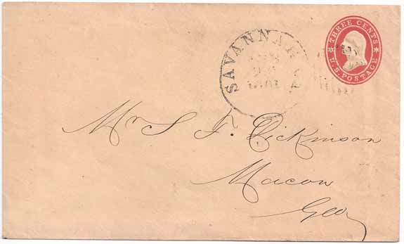 GA1286 | USA Star Die with a Grid Cancel and the Savannah, Ga CDS 20 APR 1861 USA Used in CSA Georgia. Addressed to Mr. S. F. Dickinson, Macon, Geo. The addressee was a Macon cotton factor. Minor back flap opening tear. Exceptionally clean cover. | $200.00 |