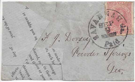 CSA #5 (Good Color) (margin touches at the top) tied by a full strike of the Savannah, Ga Paid CDS 9 SEP (1862). Addressed to Mrs. F. J. Dorsey, Powder Springs, Geo. Blue paper Adversity Cover made from a printed legal document flapped for display. Small sealed edge tear at top left center, otherwise Very Fine.