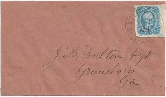 | GA1290 | CSA #12a (AD) Beautiful Milky Blue Stamp (4-Margin with a right sheet margin and a very faint upper right cover corner crease in the margin only which does not detract) tied by the Warrenton, Ga CDS 24 OCT. Coarse brown paper cover addressed to J. B. Fulton Agt (Agent), Greensboro, Ga. Very Fine. | $200.00 |