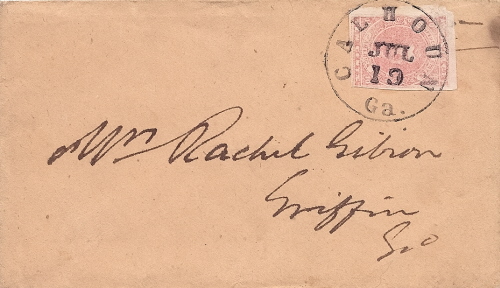 GA884 | CSA #5 (standard rose color affixed sideways with margin a little close at left upper corner and a small surface scuff at the same corner) tied by a full strike of the Calhoun, Ga CDS 19 JUL (1862). Very clean coarse brown paper cover addressed to Mrs. Rachel Gibson, Griffin, Geo. | $600.00 |