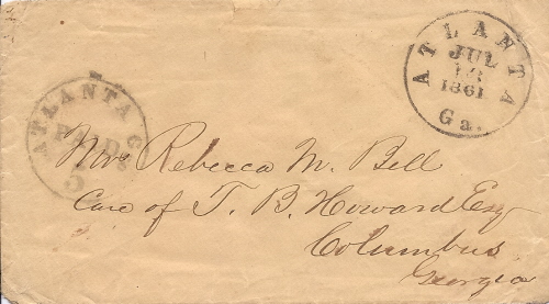 | GA896 | CSA #6xu2 Atlanta, Ga Handstamp PAID 5 Provisional dated 18 JUL 1861. Addressed to Mrs. Rebecca M. Bell Care of T. B. Howard Esq, Columbus, Georgia. Part of backflap missing and backflap tears with a little corner and edge wear, but still a very clean overall appearance. | $550.00 |