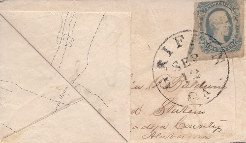 | GA907 | CSA #12 (AD) (margin touches at the top) tied by the Griffin, Ga CDS 12 SEP. Addressed to Miss Sophia T. Baldwin, Munford Station Talladega County, Alabama via Selma, Alabama. Adversity Cover made from a coastal map which shows Horse Shoe Cove. There are several Horse Shoe Coves, but this one appears to be at Sandy Hook, New Jersey. Displayed with the lower left corner flapped up. Small but complete cover Very Fine. | $400.00 |