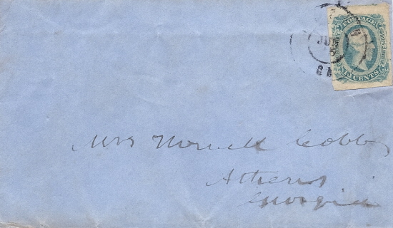 | GA938 | CSA #12 (AD) (4-Margin) tied by the small double circle Macon, Ga CDS 15 JUN. Blue paper cover from the Cobb Correspondence addressed to Mrs. Howell Cobb, Athens, Georgia. The address is in the hand of CSA Maj-Gen Howell Cobb to his wife and therefore contains the general’s indirect signature. Howell Cobb, a prominent Georgia politician, has a well-known signature that can be easily identified. Minor reduction at the right, otherwise Very Fine. | $250.00 |