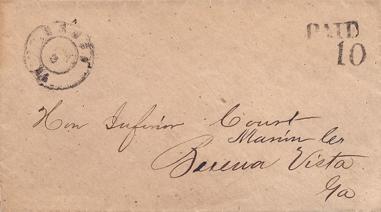 | GA998 | Handstamp PAID 10 with a slightly blurry strike of the Macon, Ga small double circle CDS 2 APR. Coarse brown paper cover addressed to Hon Inferior Court Marion Co, Buena Vista, Ga. Very Fine. | $100.00 |