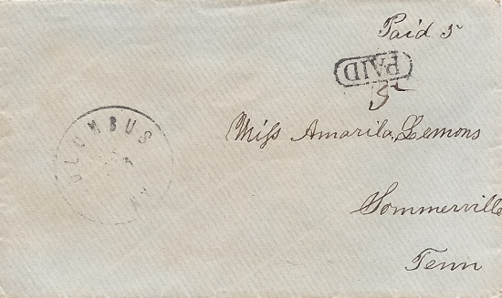 KY33 | Handstamp PAID 5(ms) with additional “Paid 5” in manuscript with a partial strike of the Columbus KY small single rim CDS (date not fully apparent). Addressed to Miss Amarila Lemons, Sommerville, Tenn. This is a known correspondence. The cover is from Lieut William R. Lacy of Co C 6th Ten Inf to his cousin. Lieut Lacy was mortally wounded in 1864 during the Atlanta Campaign and did not survive the war. Cover is complete and Very Fine. | $650.00 |