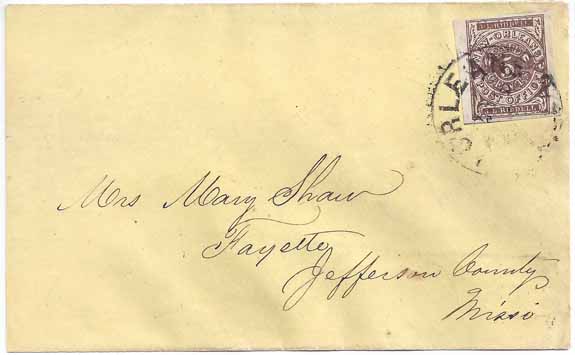 | LA385 | CSA #62x3 New Orleans 5c Brown Provisional (4-Margin) tied by the New Orleans, La CDS with a JUL 1861 date. Yellow paper cover addressed to Mrs. Mary Shaw, Fayette, Jefferson County, Miss. Small reduction at the left where opened. Very clean cover with a very nice stamp. | $400.00 |
