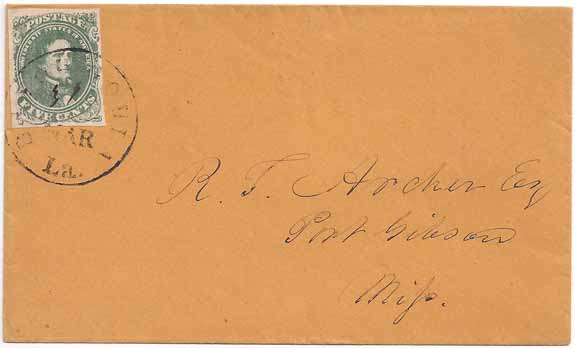 | LA387 | CSA #1 Stone 2 Position 11 (4-Margin) tied to orange paper cover by the Bayou Goula, La CDS 31 MAR (1862). Addressed to R. T. Archer Esq, Port Gibson, Miss. R. T. Archer (b1797) was a wealthy planter in Claiborne County, Mississippi. Extremely Fine. Ex-Bartels, Ex-Tate Exhibit, Ex-Kaufmann. | $400.00 |