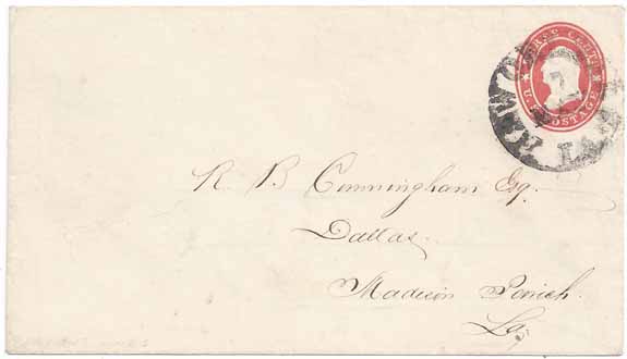 | LA400 | USA Star Die with Patent Lines tied by the New Orleans, La CDS 7 MAY (1861) USA Used in CSA Louisiana. Addressed to R. B. Cunningham Esq, Dallas, Madison Parish, La. Very Fine. | $200.00 |