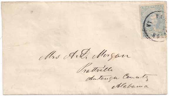 LA402 | CSA #2e Paterson Stone Y (4-Margin) tied by the small single rim Port Hudson, La CDS (appears to be dateless). Addressed to Mrs. A. D. Morgan, Prattville, Autauga County, Alabama. Minor reduction at the left where opened. Very clean cover and and a very nice stamp. | $375.00 |