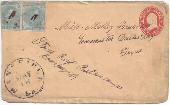 CSA #7 Horz Pair (pen-canceled) (left stamp cut into at the left) with the Mansfield, La CDS at the left lower corner 16 MAY (1863). The cover is a USA 3c Red Star Die without patent lines used as an Adversity Cover as the Star Die pays no postage. Addressed to Miss Molley Freeman, Lancaster, Dallas Co., Texas. Military endorsement "Stones Regt Partisan Rangers Company C".