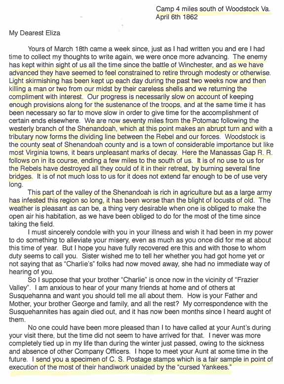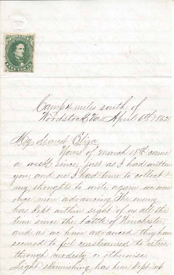 south of Woodstock Va April 6th 1862" to "My dearest Eliza." The writer
