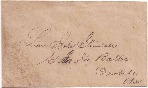CS Navy related cover hand delivered outside the postal service addressed to Lieut John Grimball, C. S. Str (Steamer) Baltic, Mobile, Ala. There is no enclosure. Minor staining at the lower left, otherwise Very Fine.