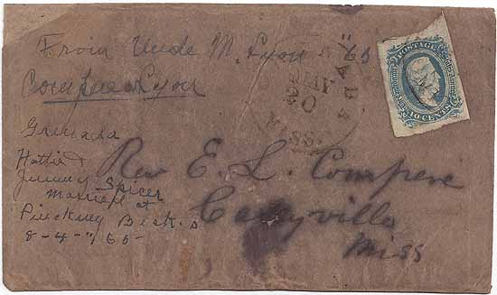 corner. Addressed to Rev E. L. Compere, Casyville, Miss. This