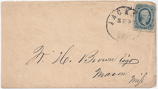 MS498 | CSA #12 (AD) (4-Margin) tied by the Jackson, Miss CDS with a SEP date. This is the last Jackson postmark used in the Confederate period from mid 1863 to May 1865 and had only the month without a day logo. Addressed to W. H. Brown Esq, Macon, Miss. Clean appearing cover with just a little edge wear, a minor reduction at the left not affecting anything, and a light water stain at the right lower corner. | $100.00 |
