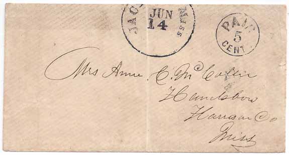 CSA $43xu1 stampless provisional cover with the Jackson, Miss CDS partially struck off the top of the cover 14 JUN (1861) and the PAID 5 CENTS provisional Handstamp in BLACK.