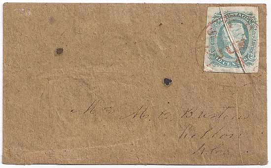 NC671 | CSA #11 (AD) (4 Large Margins and a spectacular diagonal pre-printing paper fold) tied by the RED Gaston NC CDS 8 JUN. Coarse brown paper cover, which appears to be homemade, addressed to Mr. H. C. Burton, Weldon NC. Sealed edge tear at the bottom center, backflap opening tears, and part of backflap missing. Very clean and Very Fine appearance. | $500.00 |
