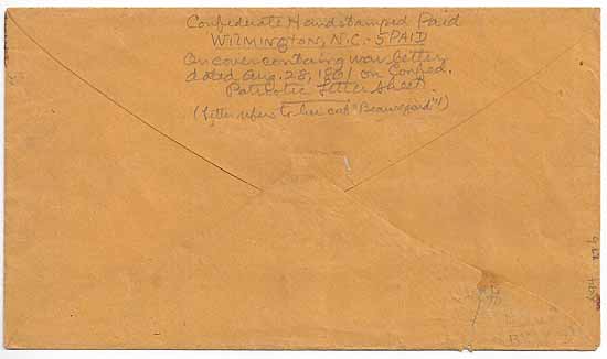 | NC688 | Wilmington NC 5 PAID within CDS Type E 28 AUG (1861). Orange paper cover addressed to Miss Caroline A. Price, Baptist Seminary, Warsaw NC. Unsigned pencil notation on the back in the handwriting and style of VanDyk MacBride referring to the original letter (no longer with the cover) on a patriotic lettersheet. Minor staining and a backflap opening tear and small edge fault at the top of the postmark. Clean cover. | $100.00 |