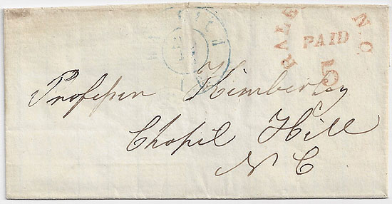 | NC704 | CSA #68xu1 Raleigh NC Handstamp PAID 5 Provisional in Blue and Red 15 AUG 1861. Addressed to Professor Kimberley, Chapel Hill NC. Very small folded lined lettersheet. Either the page with the letter has been cut away or this is a wrapper-type cover. Very Fine Appearance. | $350.00 |