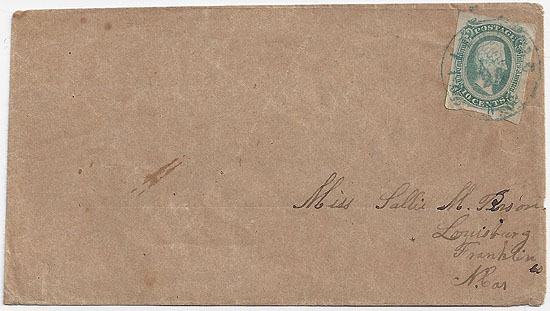 | NC777 | CSA #11c (AD) Greenish-Blue (4-Margin) tied by the BLUE Hillsboro NC small double circle CDS (date not fully apparent). Coarse brown paper cover which appears to be homemade addressed to Miss Sallie M. Person, Louisburg, Franklin Co., N. Car. Very Fine. | $100.00 |