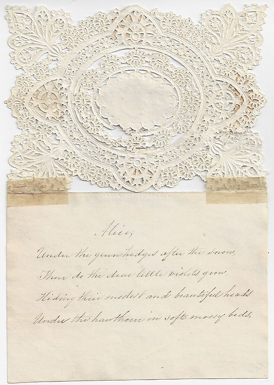 with a four line handwritten poem to "Alice" which is unsigned. Unable