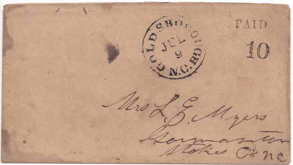 Stampless PAID cover with the Goldsborough NC CDS 9 JUL and handstamp PAID 10