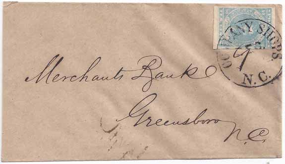 | NC976 | CSA #2 Paterson (margins a little tight left and right and affixed sideways) tied by a full strike of the Company Shops NC CDS 9 DEC (1862). Light coarse paper cover addressed to Merchants Bank, Greensboro NC. Exceptionally clean cover. Ex-Morris Everett. | $150.00 |