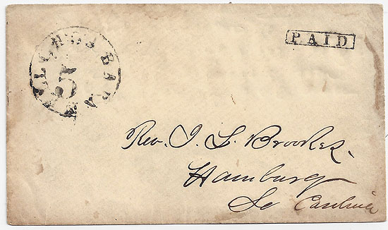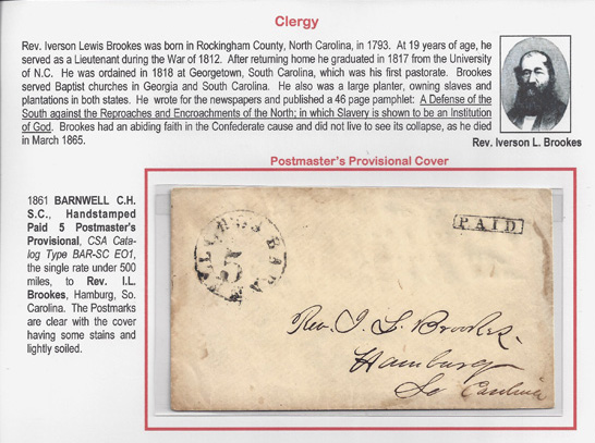 | NE1 | CSA #123xu1 Barnwell CH SC PAID 5 Provisional (undated) addressed to Rev I. L. Brookes, Hamburg, So. Carolina. A little water staining visible only at the top of the back of the cover. Otherwise, a Very Fine appearance. | $2,000.00 |