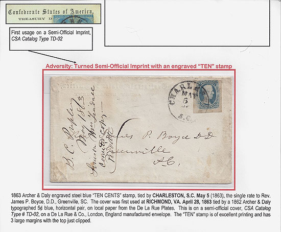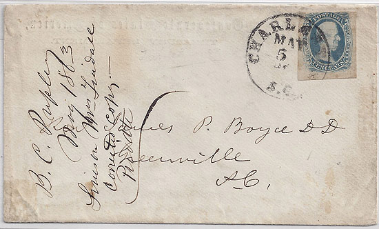 CDS 5 MAY (1863) to Rev James P. Boyce, Greenville SC. Period receiving